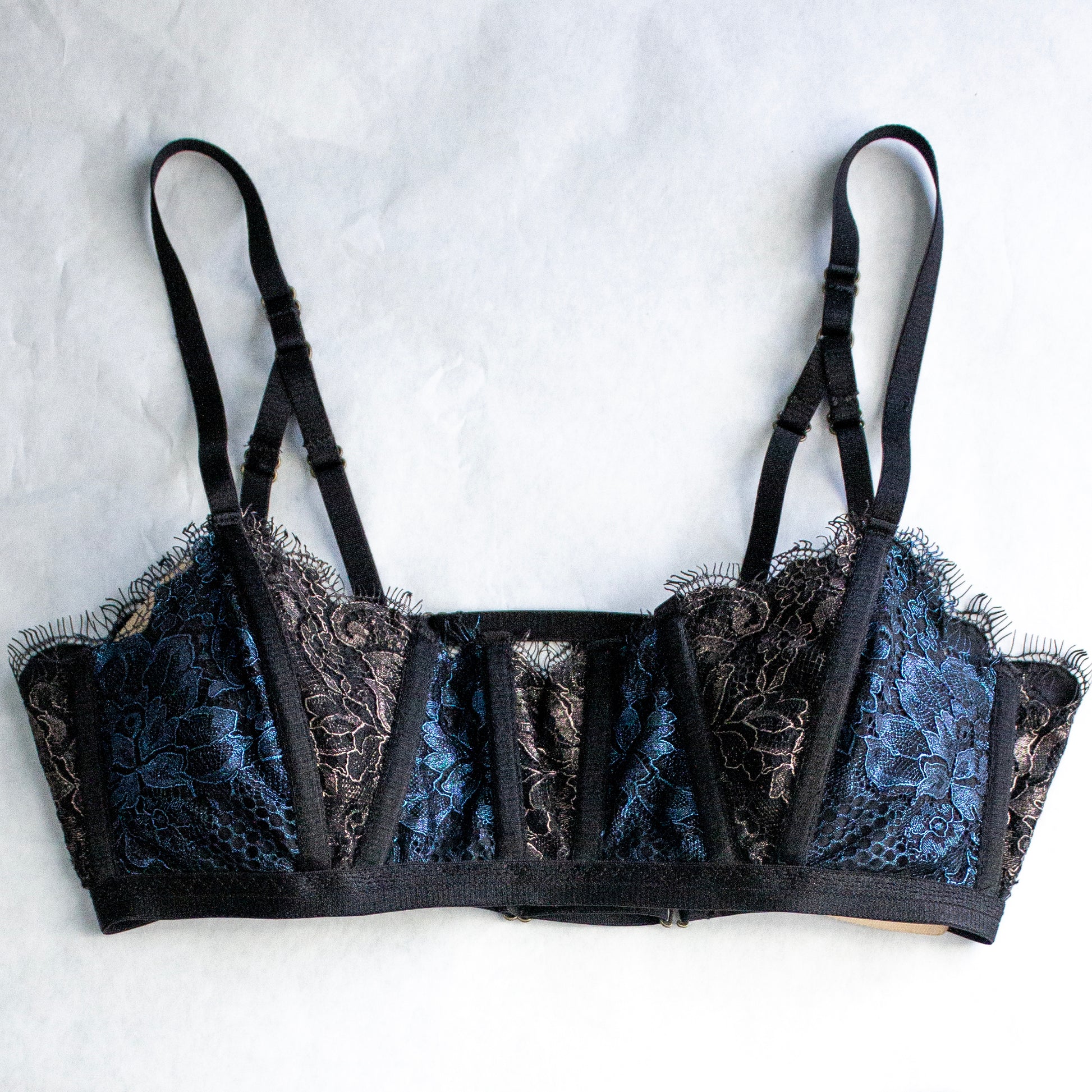 'Shattered Glass' Lace Bustier Bra is crafted with intricate tilted lace panels in contrasting bronze and blue metallics, resembling a stained glass and revoking a sense of dark academia and spirituality. Enhanced with internal boning on each panel, this lace bralette offers unparalleled support and structure, ensuring a comfortable and flattering fit. Designed with adaptability in mind, Pagan Poetry bustier bra features an adjustable back, accommodating a range of sizes with ease. With lustrous metallic lace and luxurious high quality black elastics from Japan, this piece is a treat for any lingerie lover.